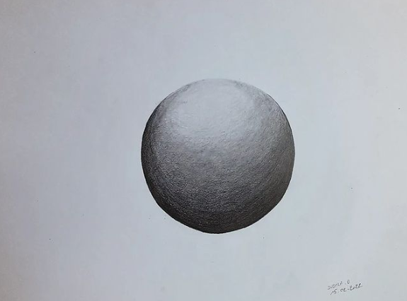 Dessiner au crayon de papier sans utiliser un compat, un cercle le plus rond possible. Puis donner l'illusion d'une sphère avec des jeux d'ombres et de lumières, d'atténuation, de contrastes, et de nuances de couleurs.